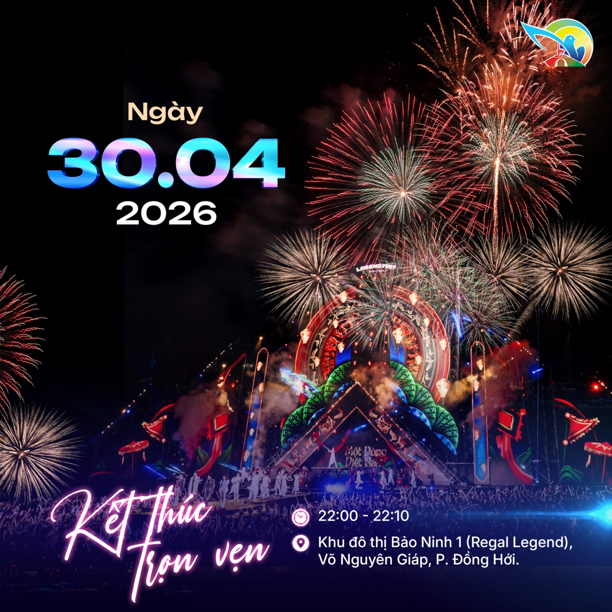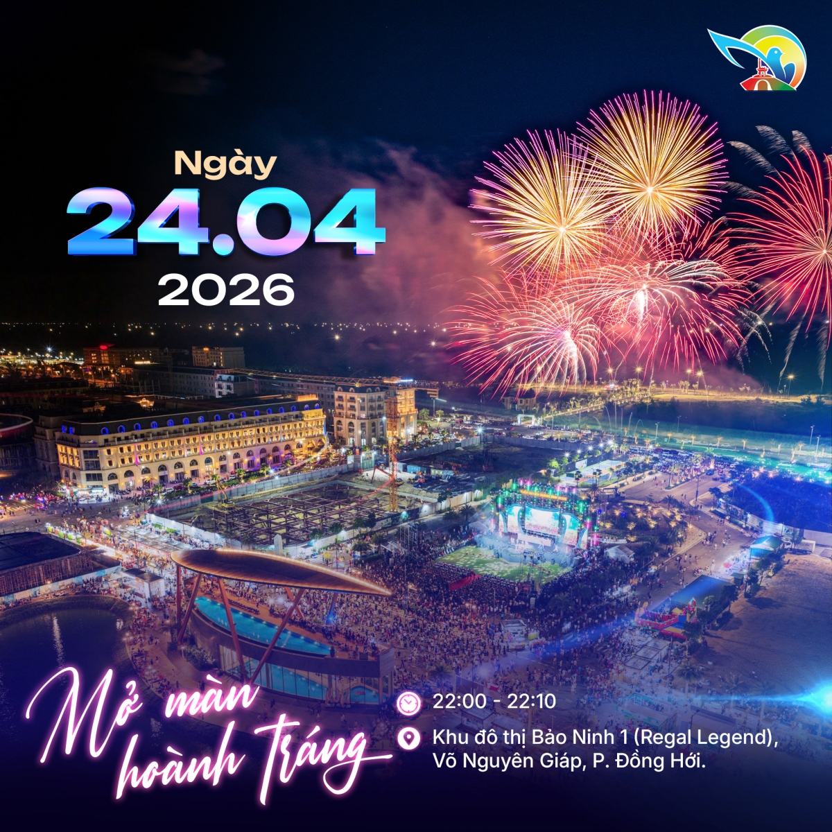Regal Legend Đồng Hới sẽ tổ chức trình diễn pháo hoa rực rỡ nhân dịp lễ 30/4/2026 trong khuôn khổ Tuần Văn hóa Du lịch. Các đêm pháo hoa tầm thấp dự kiến thắp sáng bầu trời Bảo Ninh vào ngày 24/4 và đêm 30/4, cùng chuỗi 7 ngày đêm sự kiện sôi động, biến nơi đây thành tâm điểm du lịch.