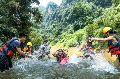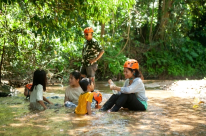 15:30 Quý khách tự do tắm suối, chèo thuyền Kayak/SUP. Trẻ em nghịch cát bên bờ suối.