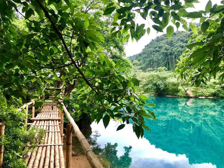 Cả thung lũng được bao bọc bởi các dãy núi sừng sững, trùng điệp. Ngay từ lần đầu tiên đến bạn sẽ có cảm tưởng như mình đang lỡ nhịp lạc vào một xứ sở thần tiên trong câu chuyện cổ. Với gam màu xanh lục của núi rừng, cây cối hoà quyện hoàn mỹ với sắc xanh ngọc bích của dòng nước đã vẽ nên một tuyệt tác thiên nhiên lãng mạn, trong trẻo. Sở hữu nét đẹp mê hoặc lòng người nên thung lũng Ngọc Bích chắc chắn là một địa điểm du lịch Quảng Bình mà bạn không thể bỏ lỡ.